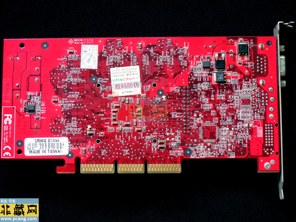PCB布局:6层绿色公版设计,显存颗粒为三星K4D263238D-TC36(3.6ns,500MHz),正反共4颗(64MB版本)。